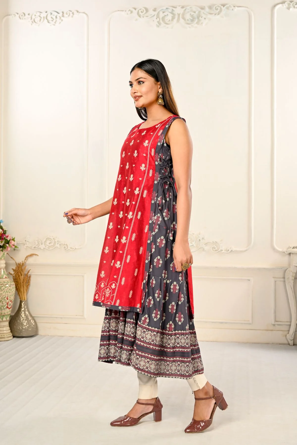 This Red & Purple Inner Cotton And Outward Jacket Chanderi Kurti is perfect for those who love to stand out in style. Showcasing fashionable inner cotton and outward Chanderi jacket, this kurti is an eye-catching piece of clothing with its bold red and purple colors. It is a great combination of comfort and style.