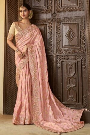Give in to the divine confluence of today and tomorrow in this beautiful attire. You are sure to make a strong fashion statement with this beautiful Light Pink colored designer saree. Shop online for this saree which is made of Pure Banarasi Kanjivaram fabric and is beautifully crafted with Embroidery Work. Pair this saree with ethnic jewellery and a pair of heels to elevate your style. This saree comes with mehendi green colored, art silk blouse fabric.