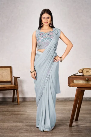 Sky-Blue Shimmer Georgette Saree With Beautiful Embroidery