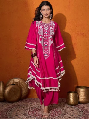 - Color – Available in vibrant shades with delicate floral embroidery and mirror work accents