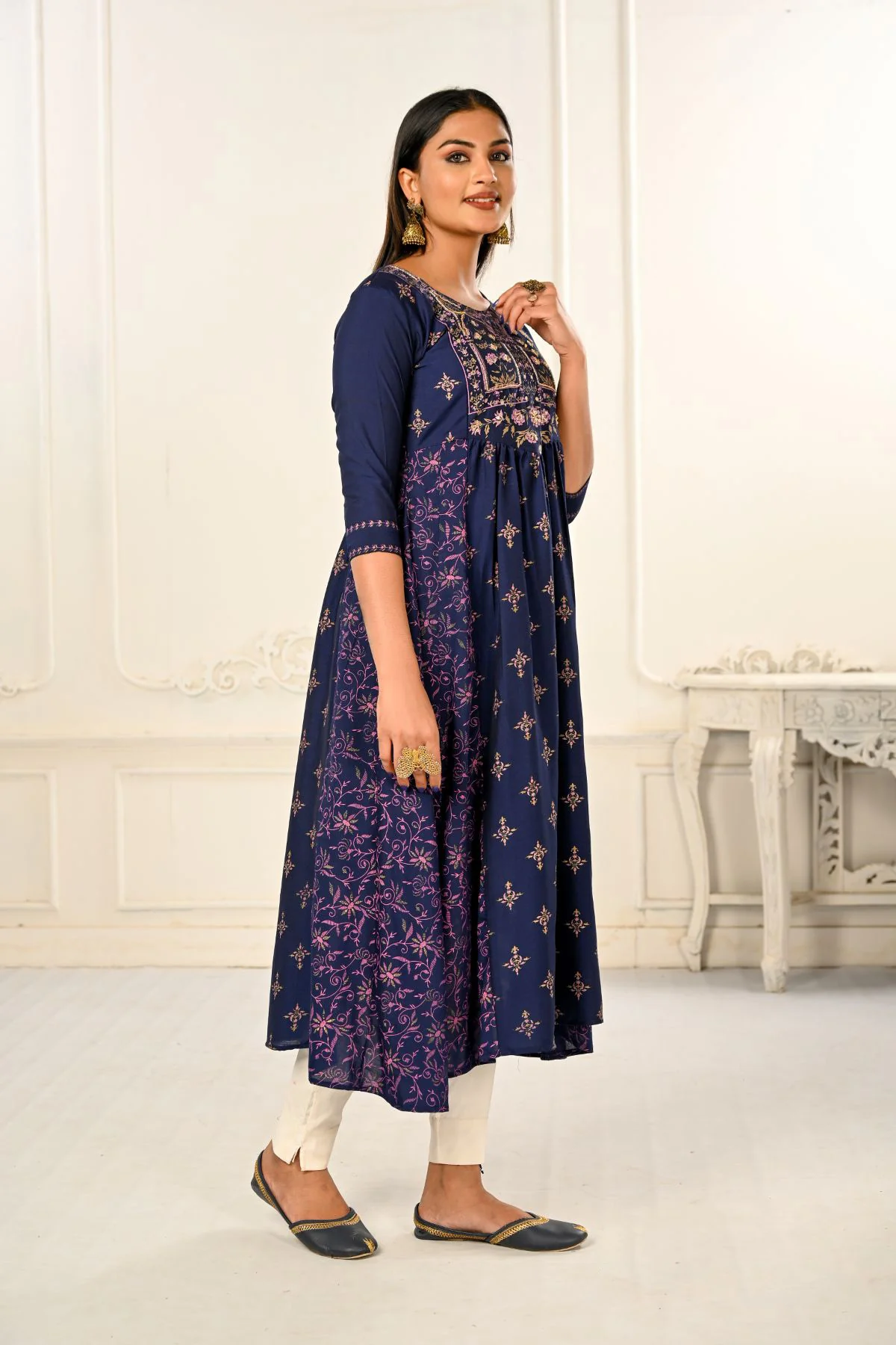 Utsa Blue Embroidered A-Line Cotton Blend Tunic