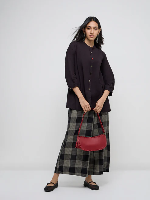 Utsa presents this black ethnic tunic featuring floral embroidery at the back. Crafted from a cotton-linen blend, it is complemented by a band-neck which extends to a button placket and three-quarter sleeves.