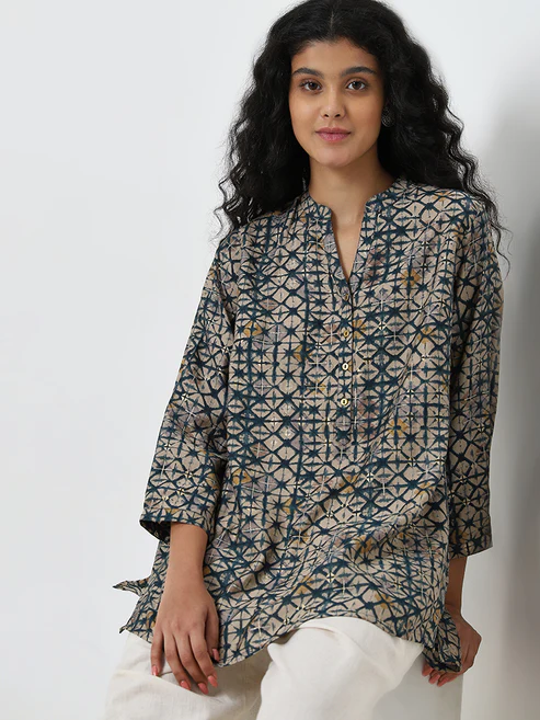 Utsa brings you this blue kurti in an A-line silhouette featuring a diamond tie-dye design. It is made from a breathable fabric showcasing a notched collar and three-quarter sleeves for a graceful silhouette.